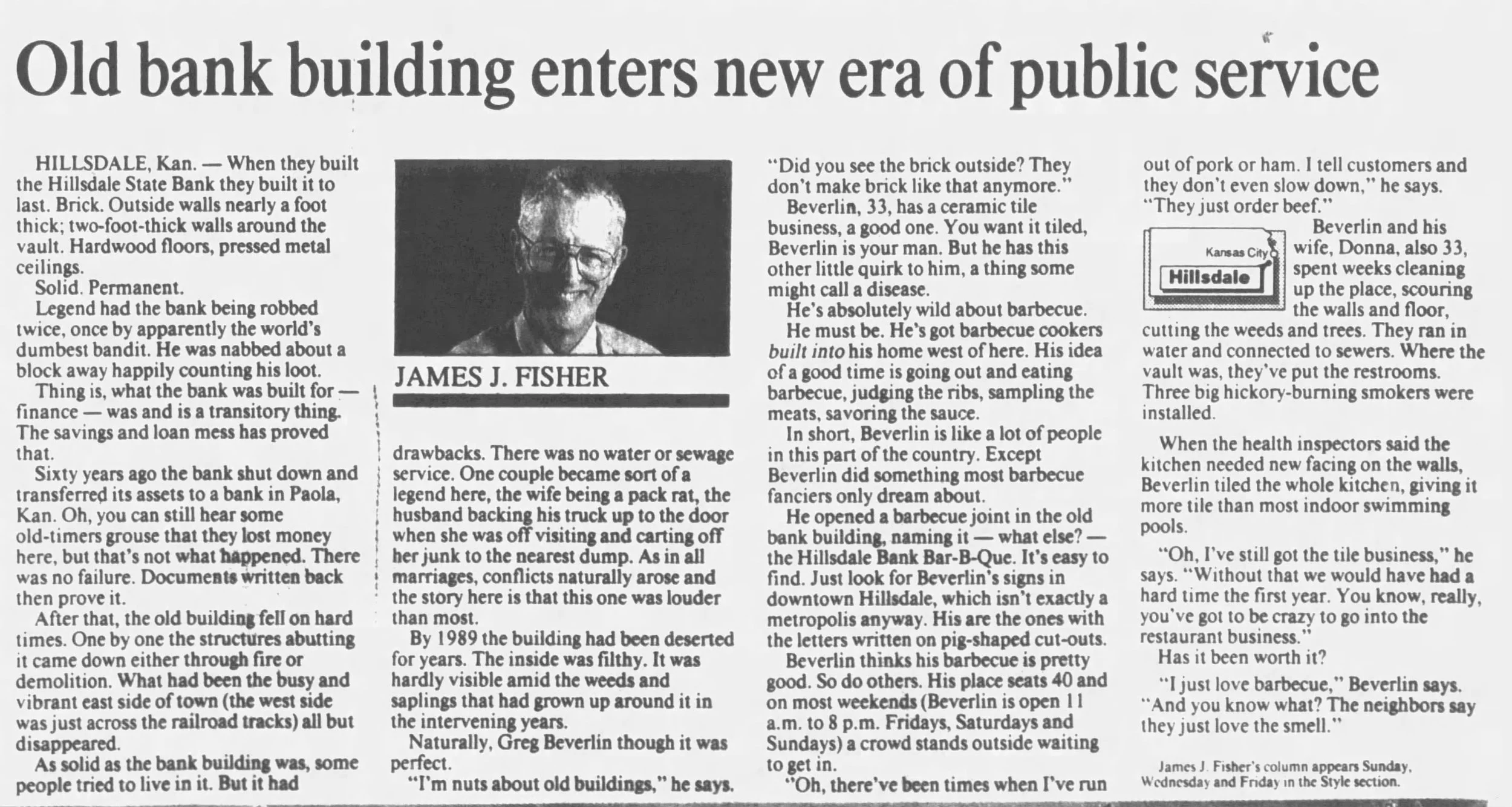 Hillsdale Bank Bar B-Q to close after 12 years. By this time next month, the aroma of the air around Hillsdale will be a lot less mouth-watering. —Kansas City Star